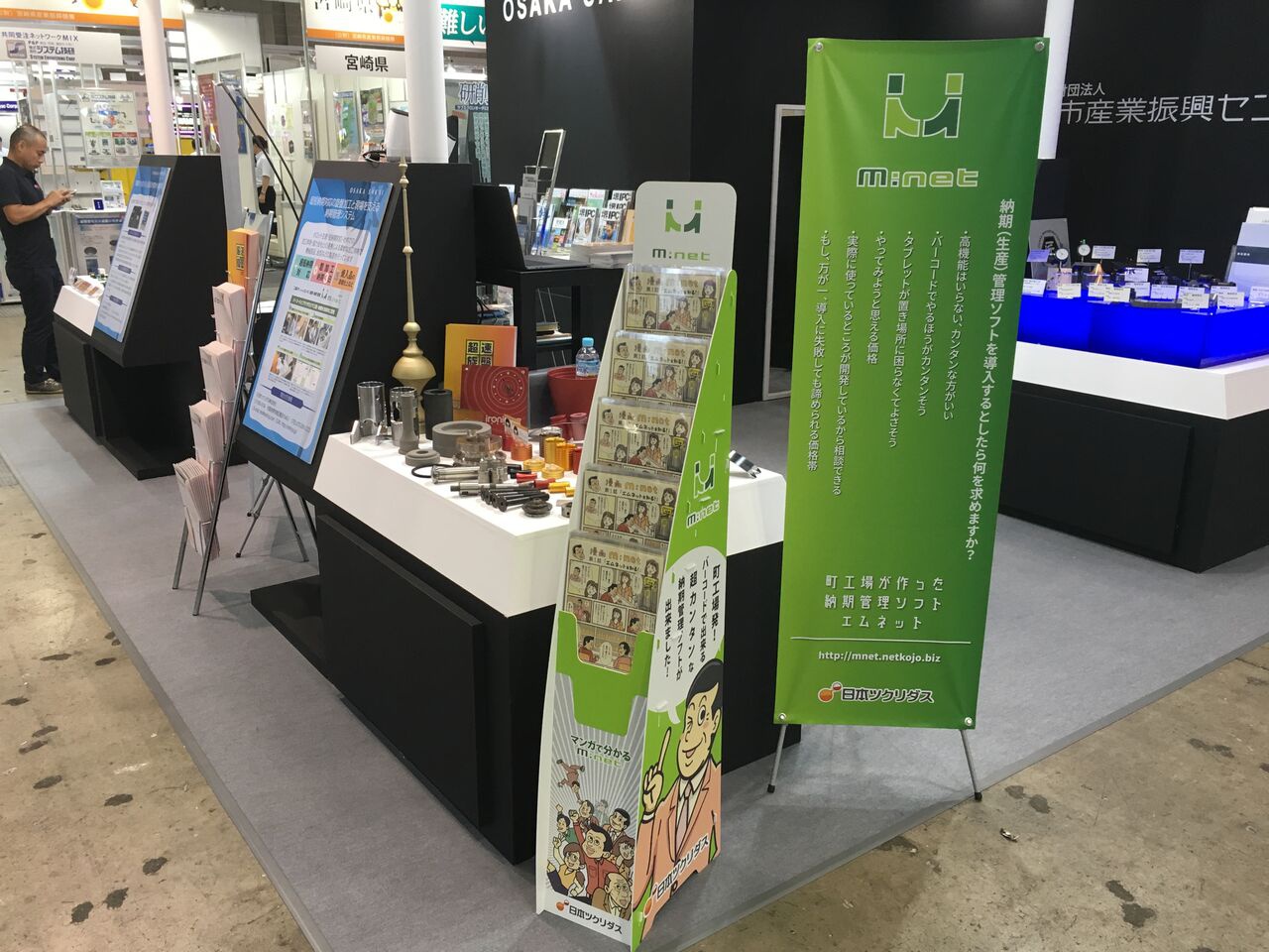 さて、今回日本ツクリダスのブースには、2つのスタンドバナーが立てられました。“超速旋盤”というロゴが書かれたものがひとつと、もうひとつは“M:net”のスタンドバナーです。その横には、皆様おなじみM:net漫画が置かれていますね。