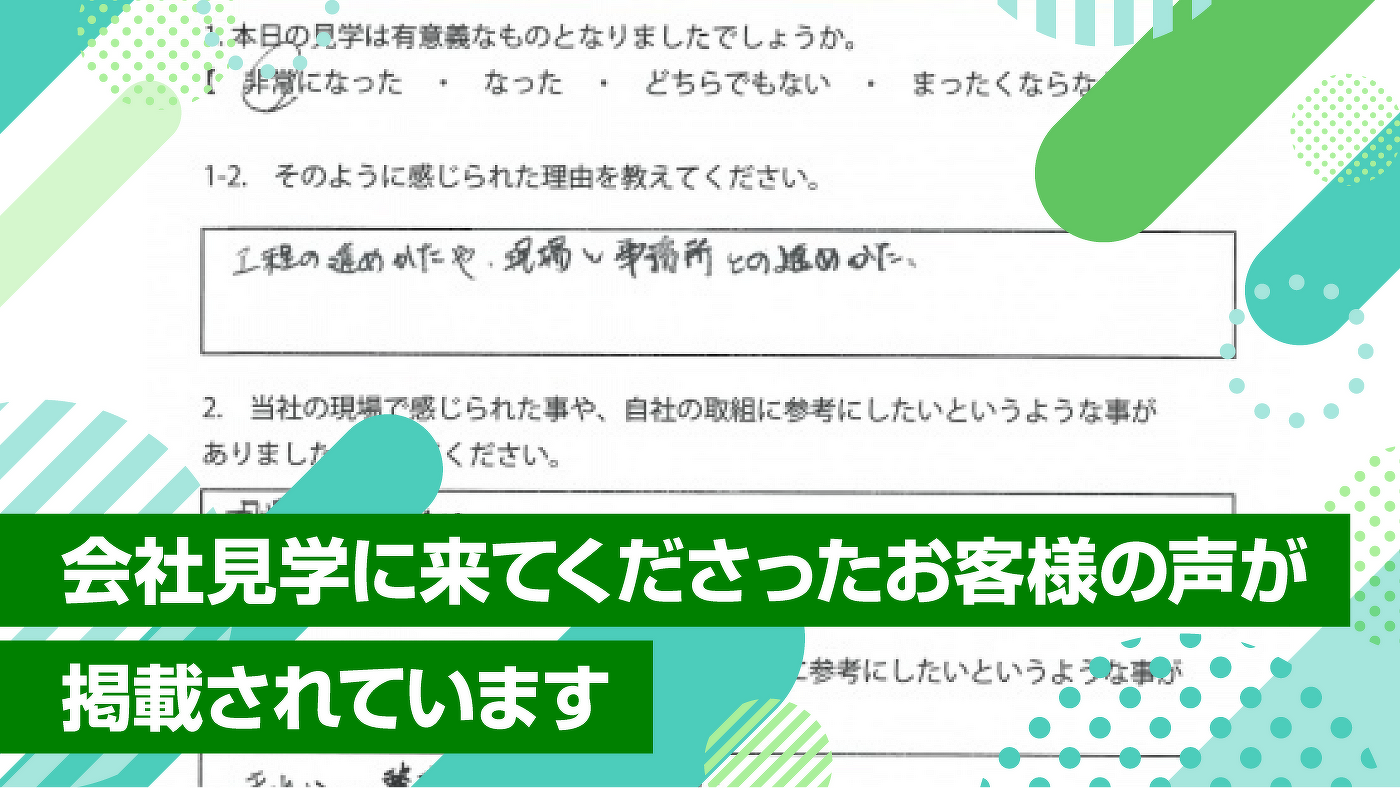 アンケートのページを見てみると、お客様からは「会社見学が非常に参考になった」「書類の管理方法やコミュニケーションの取り方が参考になった」という声が多く寄せられていました。