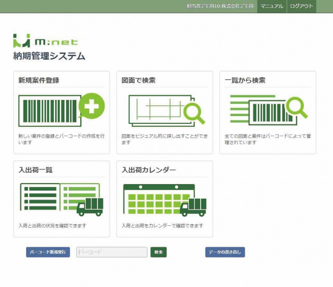 トップ画面は、新規の案件登録や、図面または一覧などから検索、入出荷のカレンダーなどの操作に入っていけるようになっています。